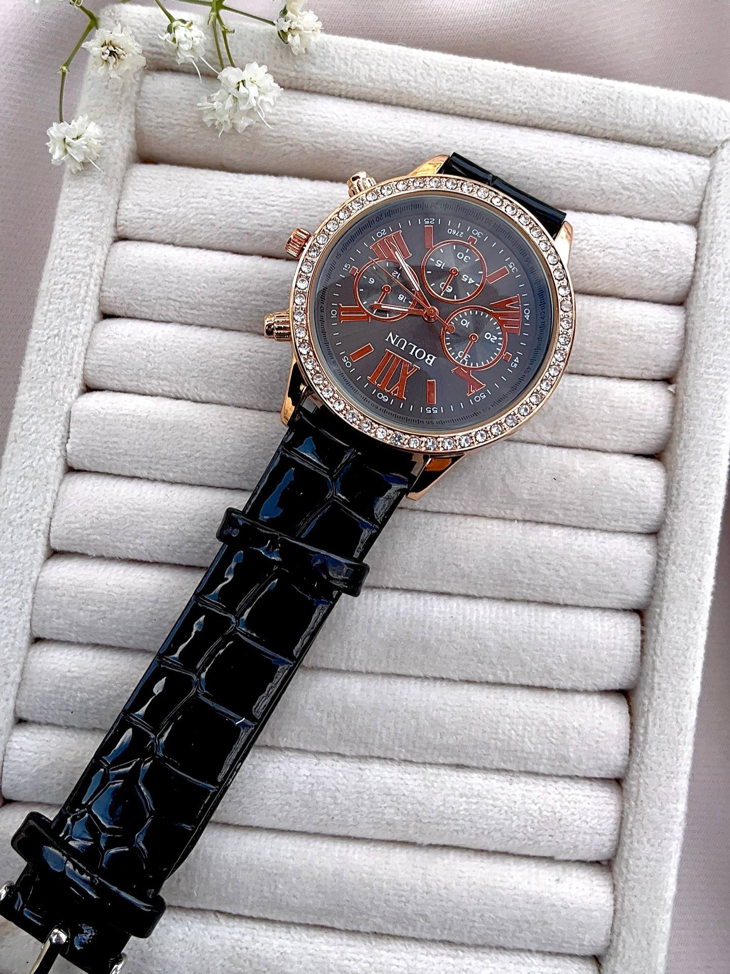 ساعت بند چرمی مشکی طرح سه موتوره بولون